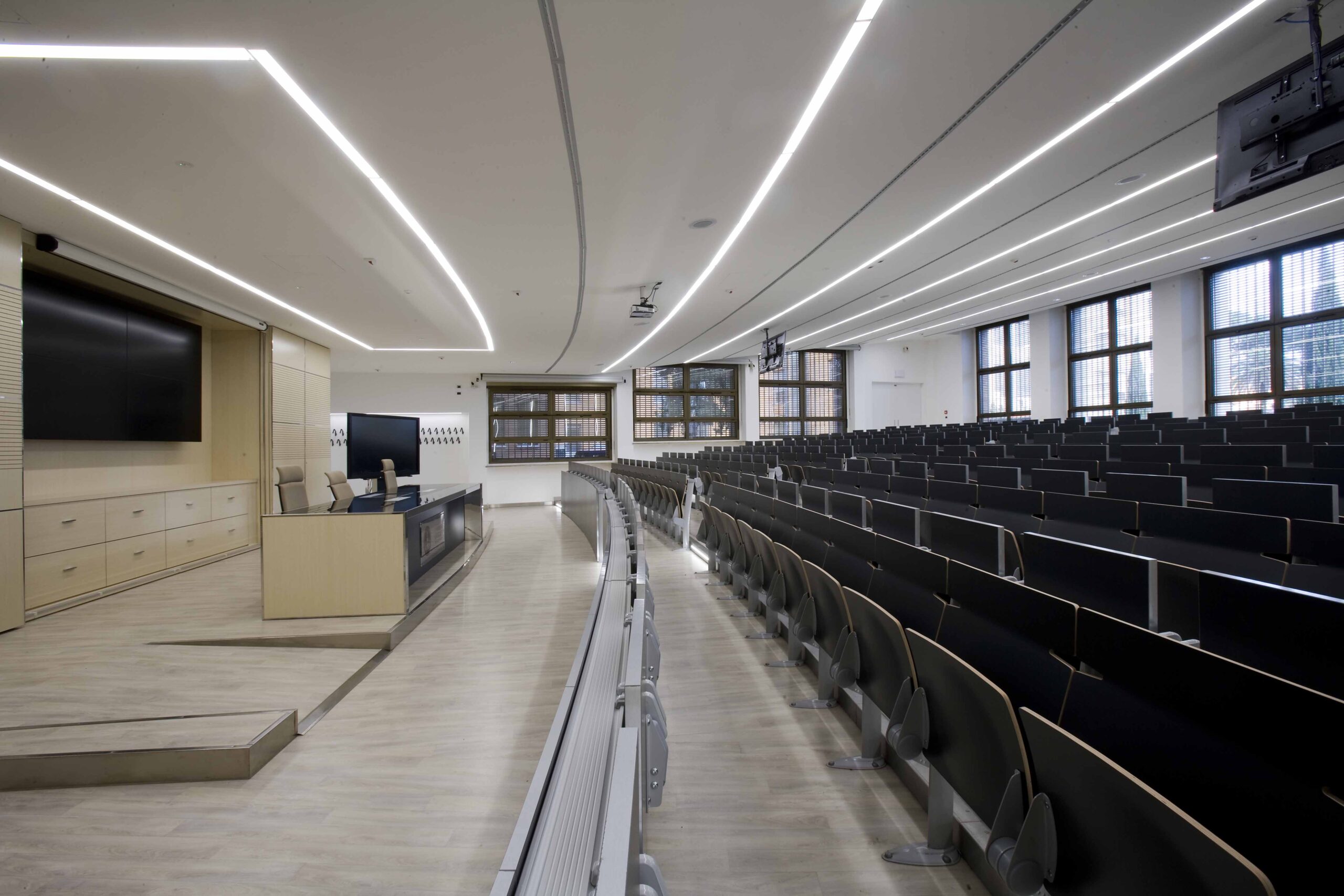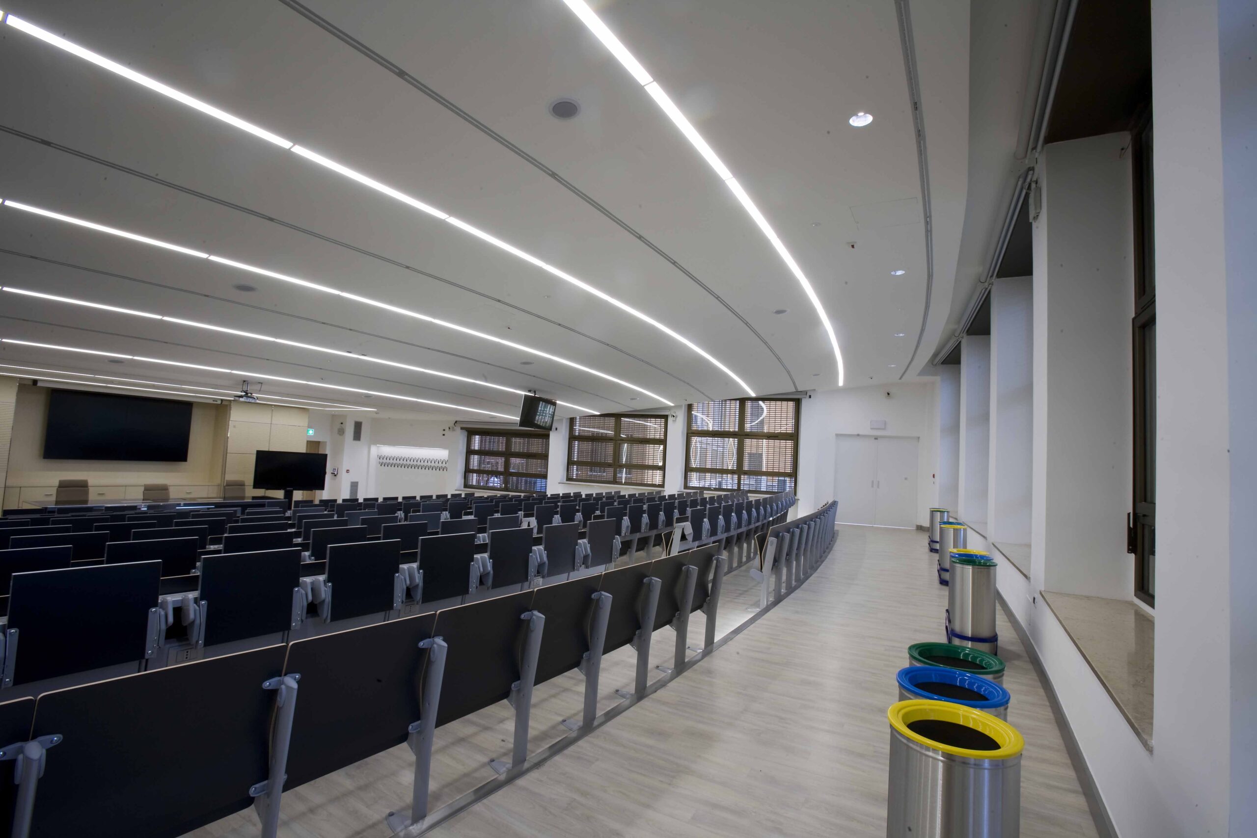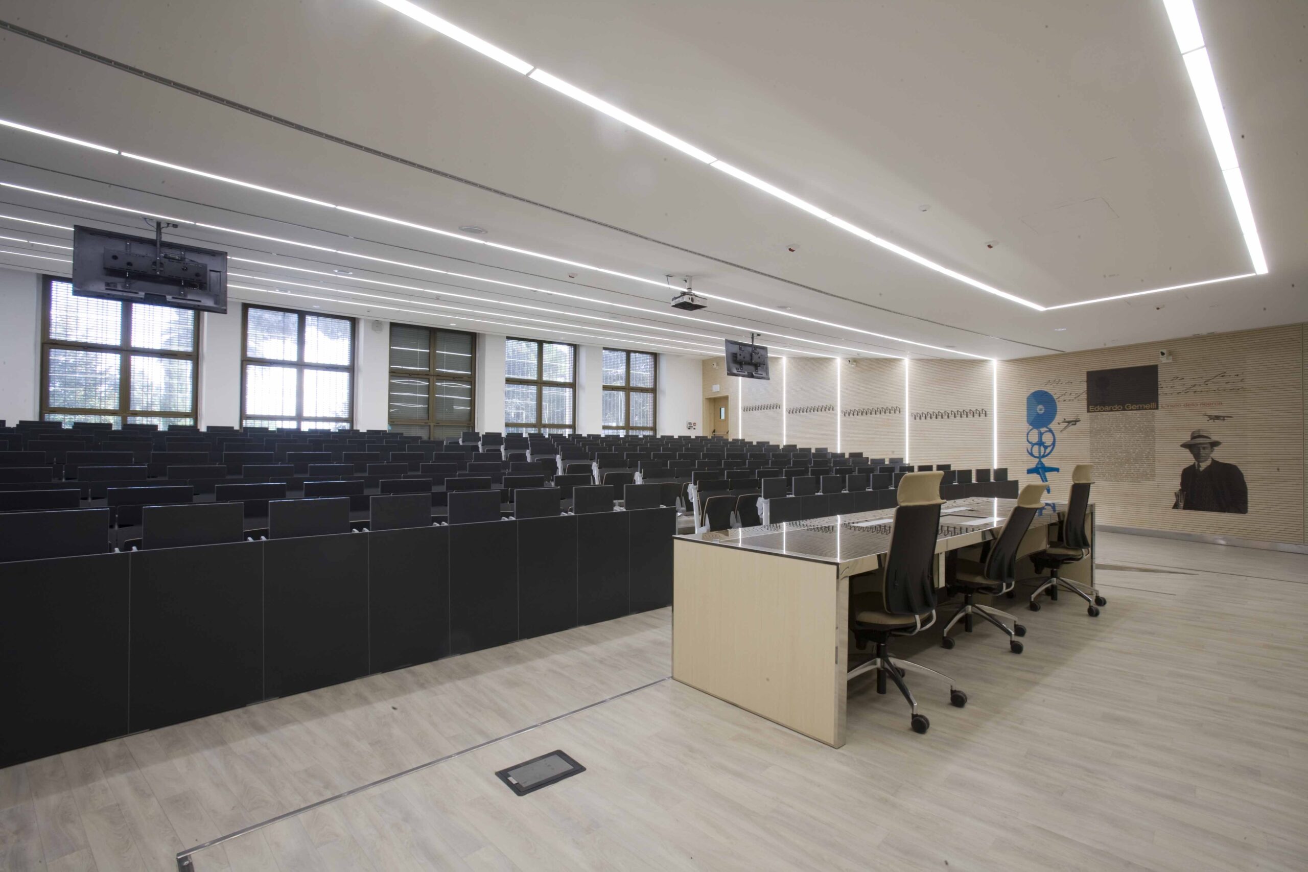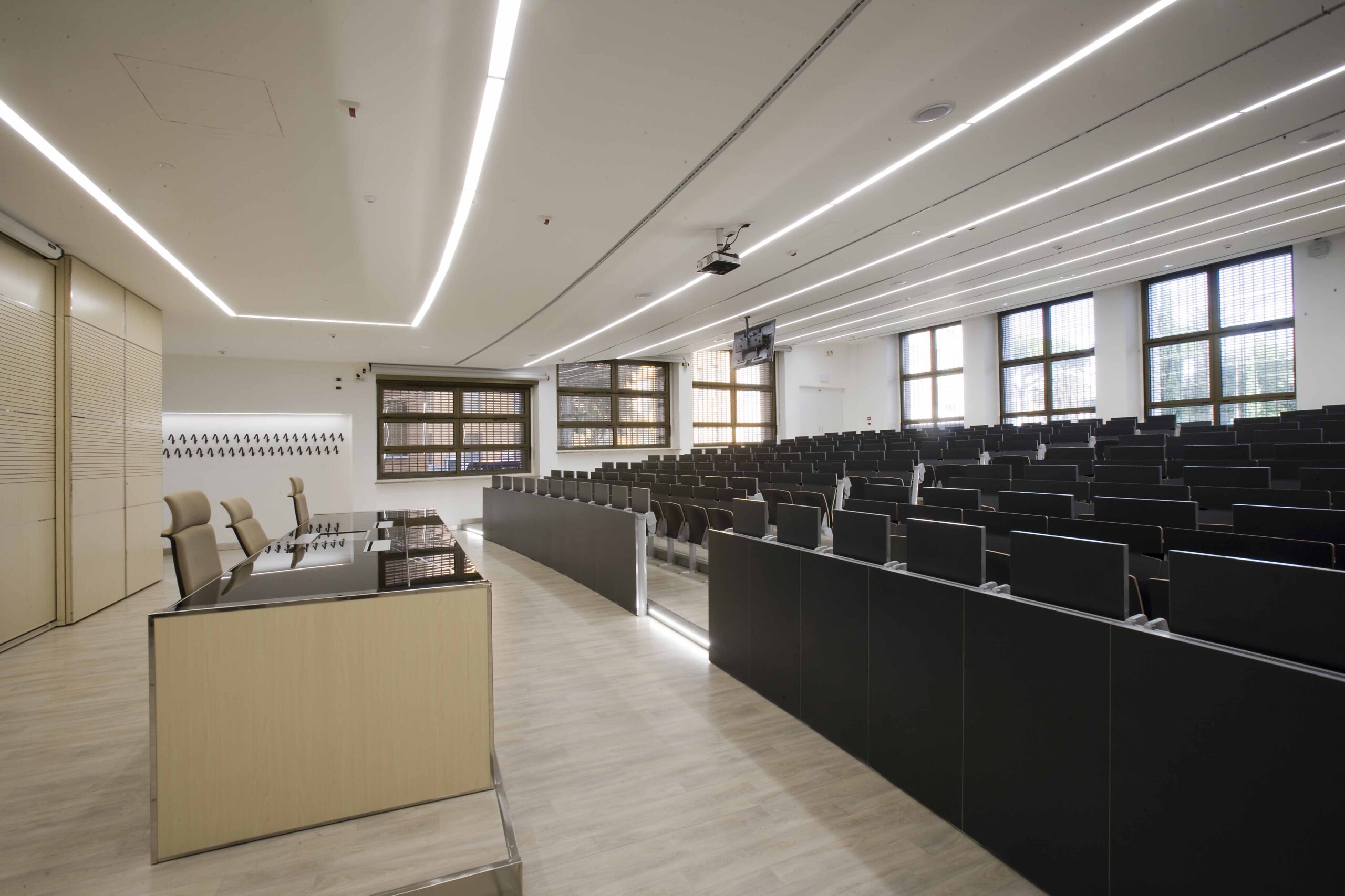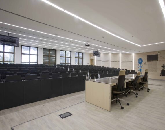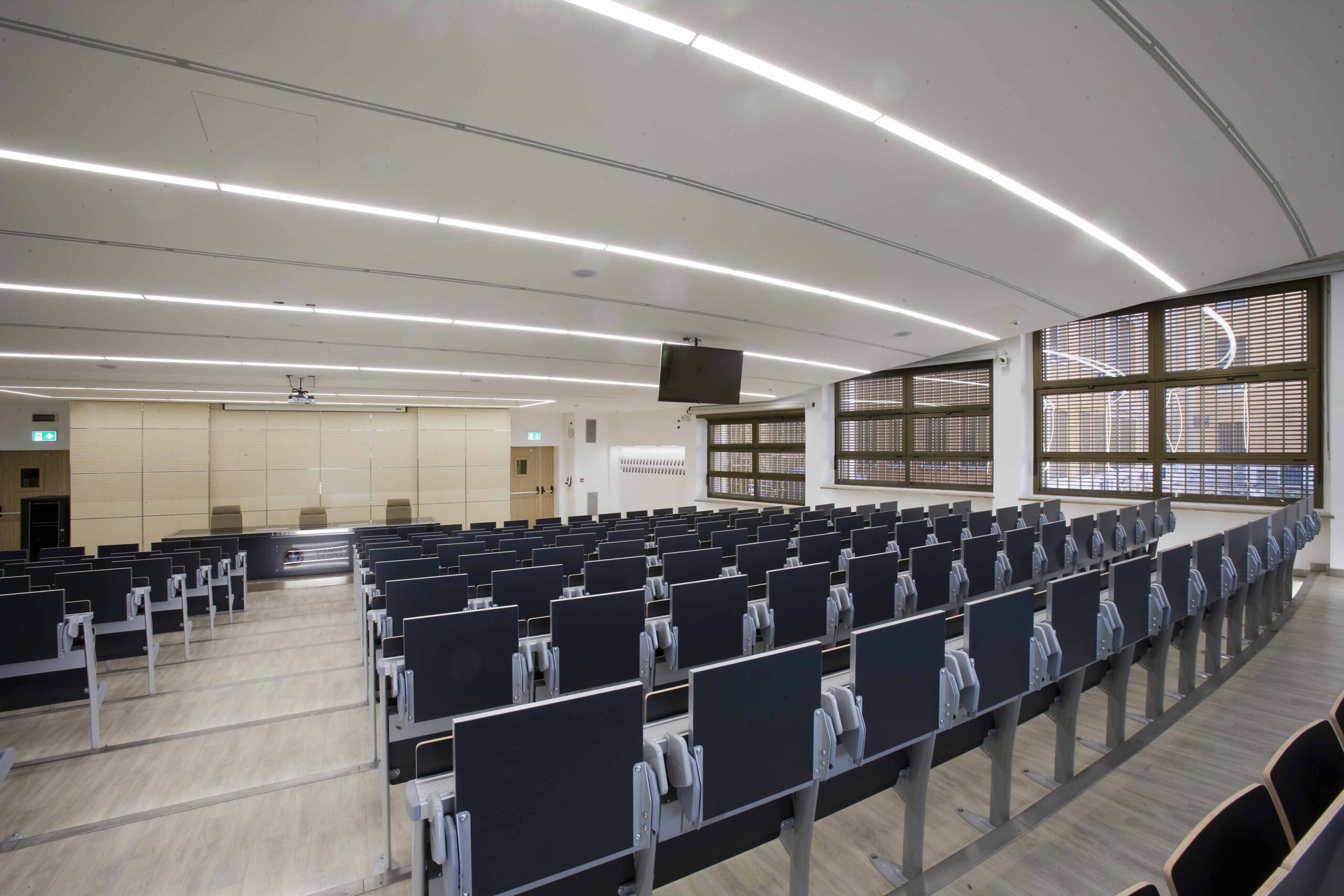 L’aula si sviluppa su 800 mq gradinati semicircolari, sui quali sono state posizionate 200 sedute. I 4 lati dell’aula presentano due grosse vetrate, una sul lato sx e l’altra sul fondo della stessa, tutte dotate di doppio oscuramento. Le due pareti restanti sono occupate, una da una quinta di fondo, una parete didattica attrezzata in cui sono inseriti monitor e telo per le proiezioni in aula. La quarta parete laterale e invece rivestita di uno strato di doghe fonoassorbenti per ottimizzare l’acustica dell’aula.