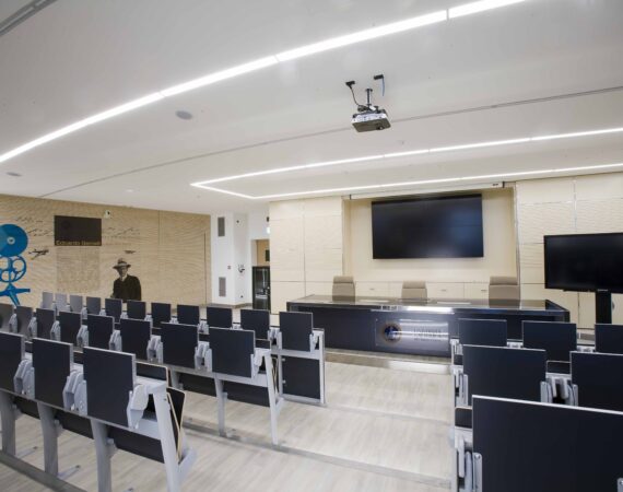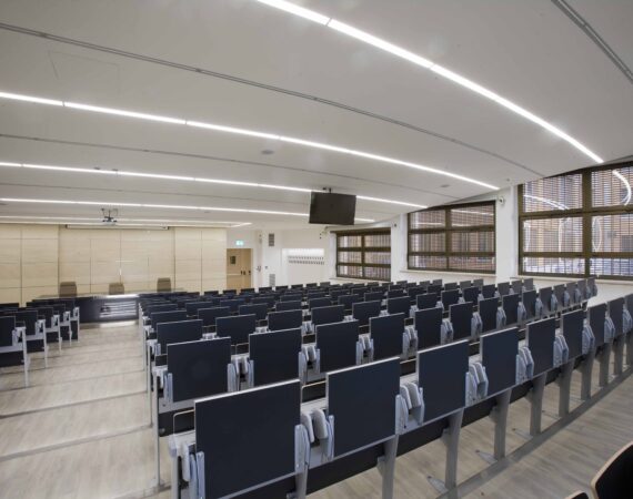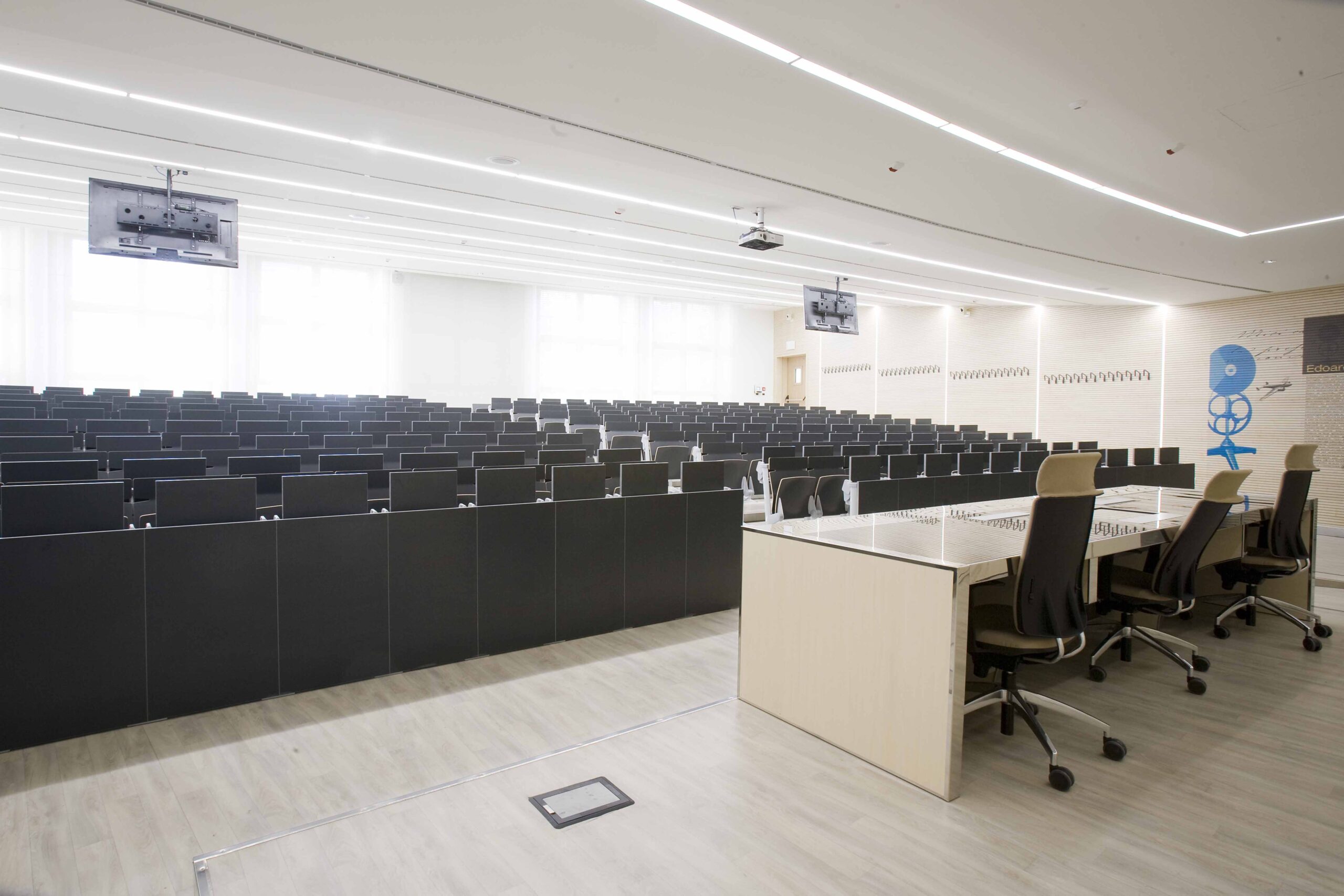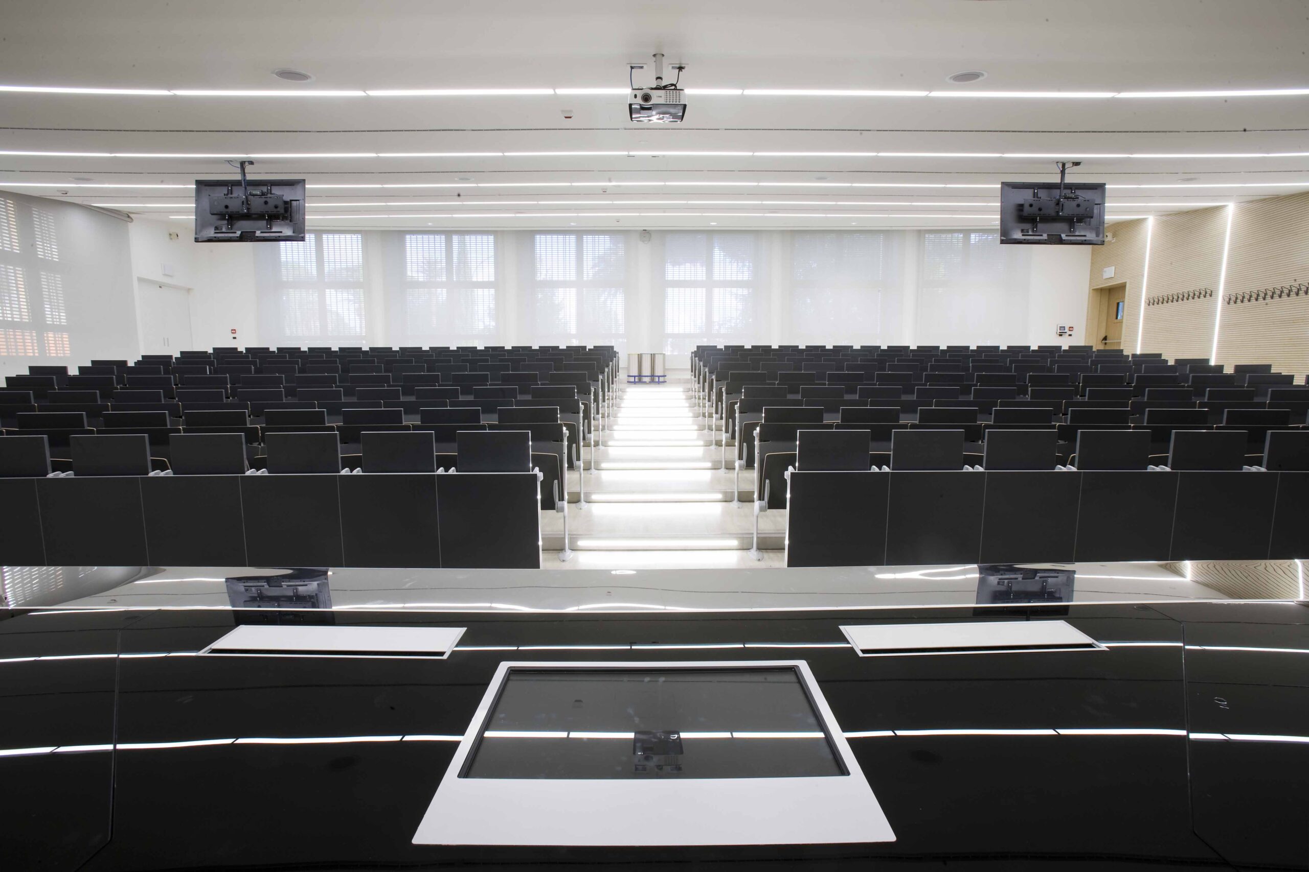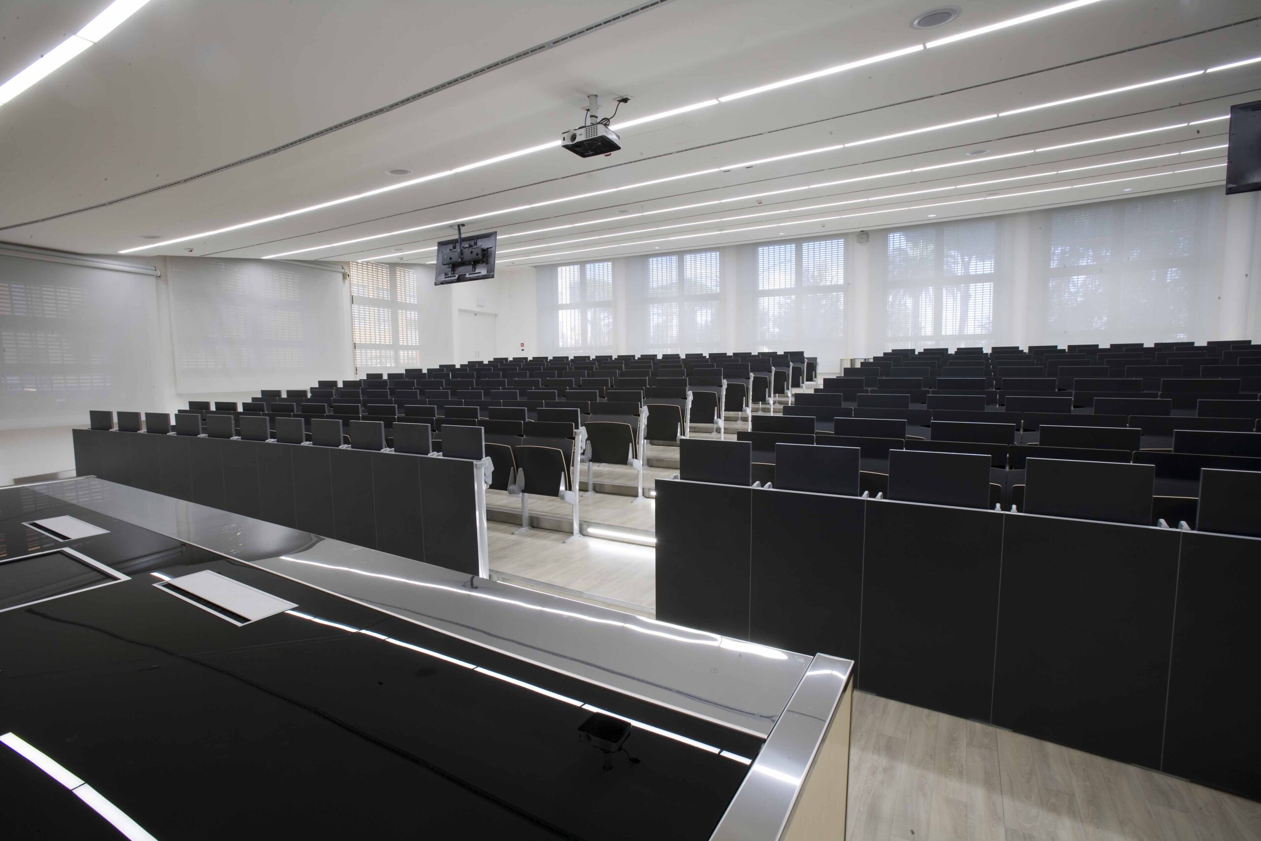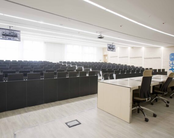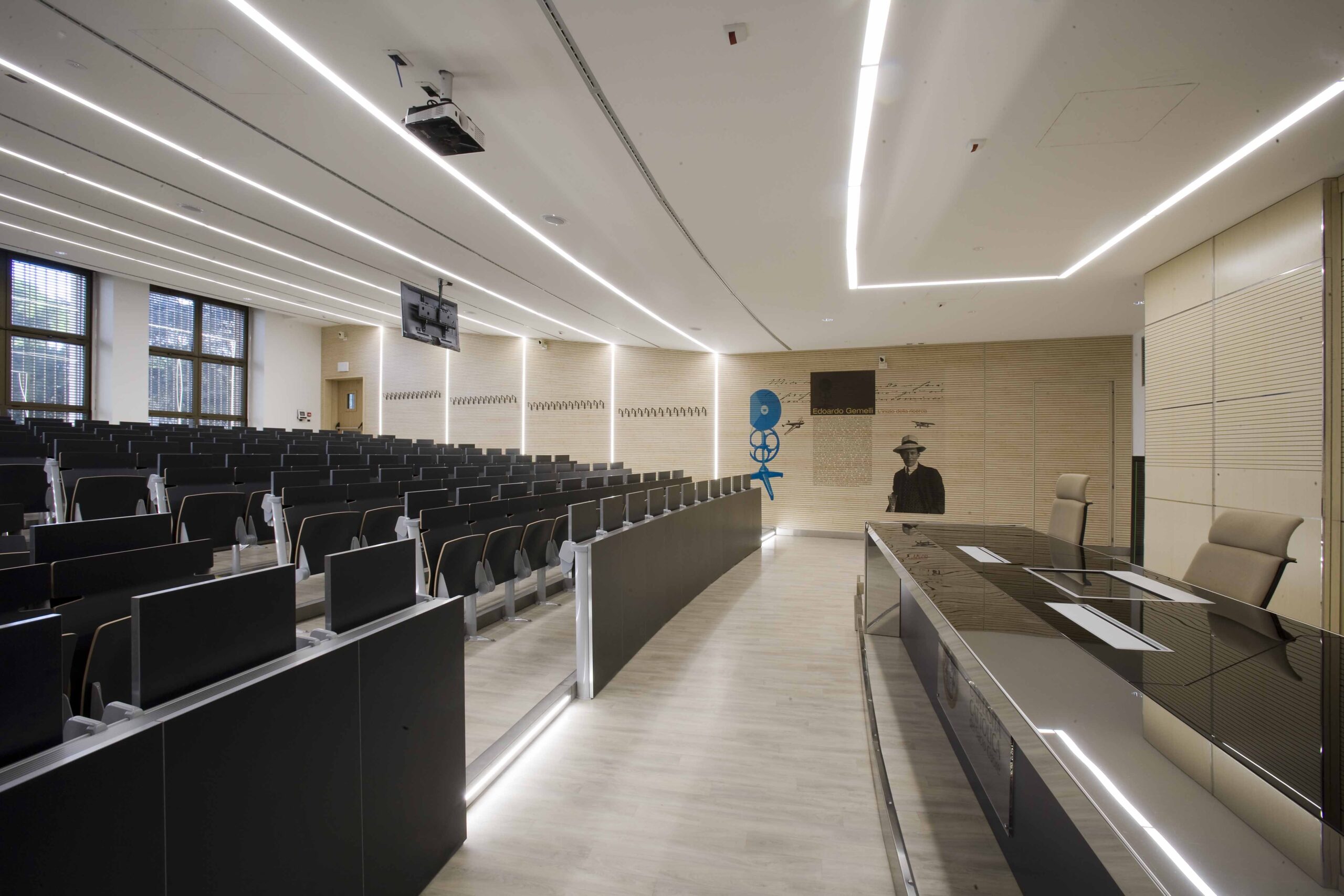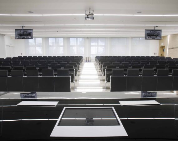 L’aula si sviluppa su 800 mq gradinati semicircolari, sui quali sono state posizionate 200 sedute. I 4 lati dell’aula presentano due grosse vetrate, una sul lato sx e l’altra sul fondo della stessa, tutte dotate di doppio oscuramento. Le due pareti restanti sono occupate, una da una quinta di fondo, una parete didattica attrezzata in cui sono inseriti monitor e telo per le proiezioni in aula. La quarta parete laterale e invece rivestita di uno strato di doghe fonoassorbenti per ottimizzare l’acustica dell’aula.