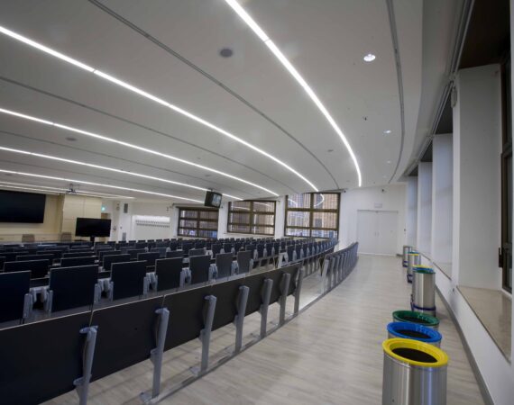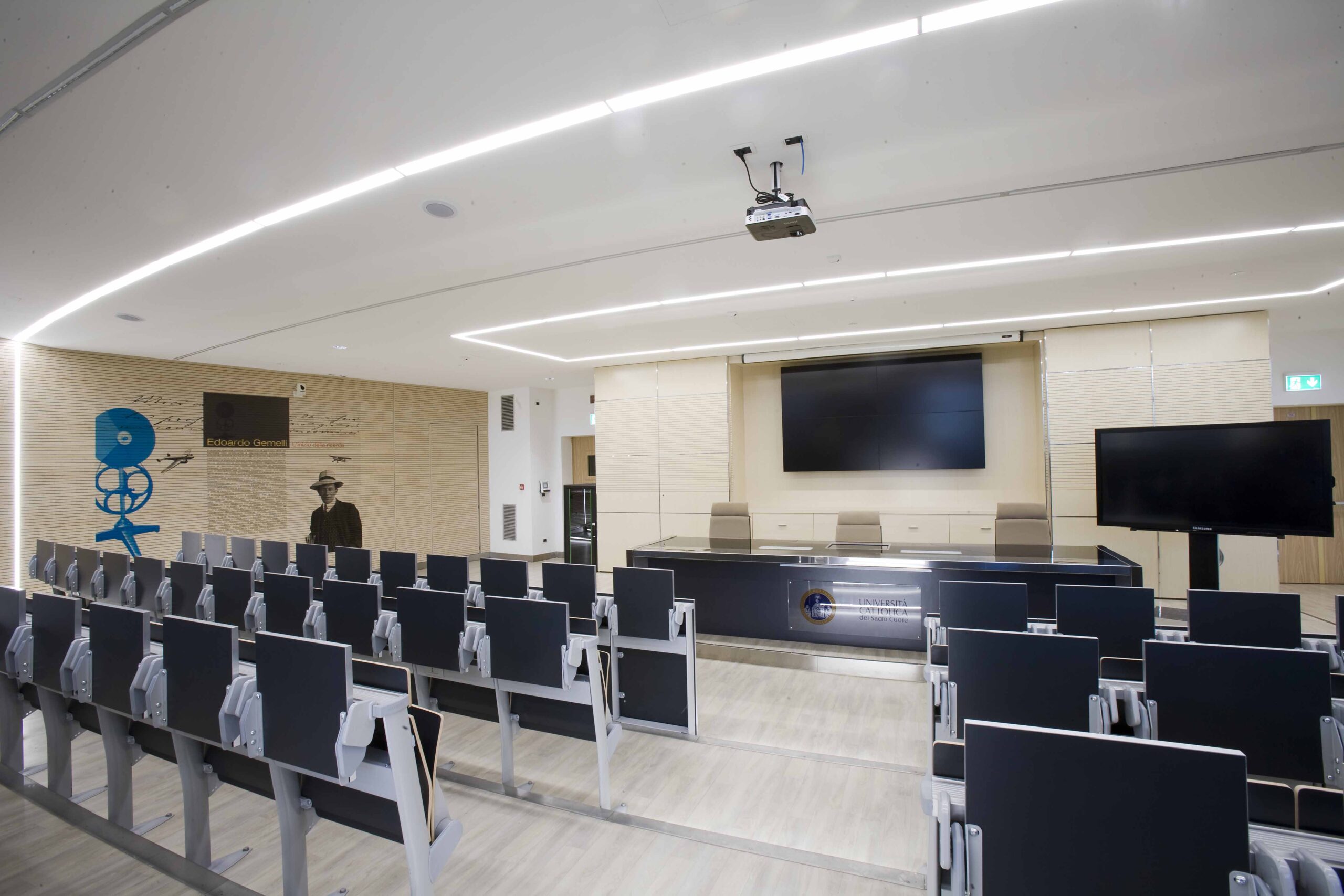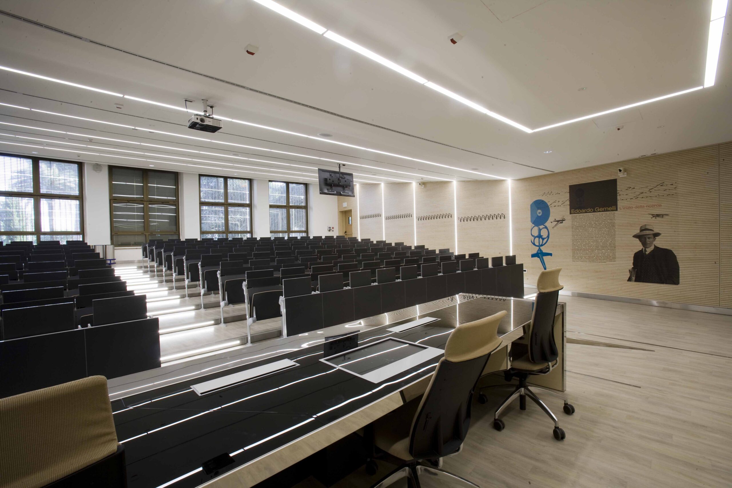 I controsoffitti seguono l’andatura semicircolare dei gradoni e ospitano al proprio interno feritoie e luci lineari anch’esse della stessa geometria. Tutta l’aula e dotata di sistema domotico, oltre agli scenari di luce per la video-proiezione permette  il collegamento videoconferenze con le sale operatorie, per lezioni interattive, inoltre la cattedra è dotata di un touch screen a filo, in grado di gestire le lezioni, archiviare i file delle stesse.